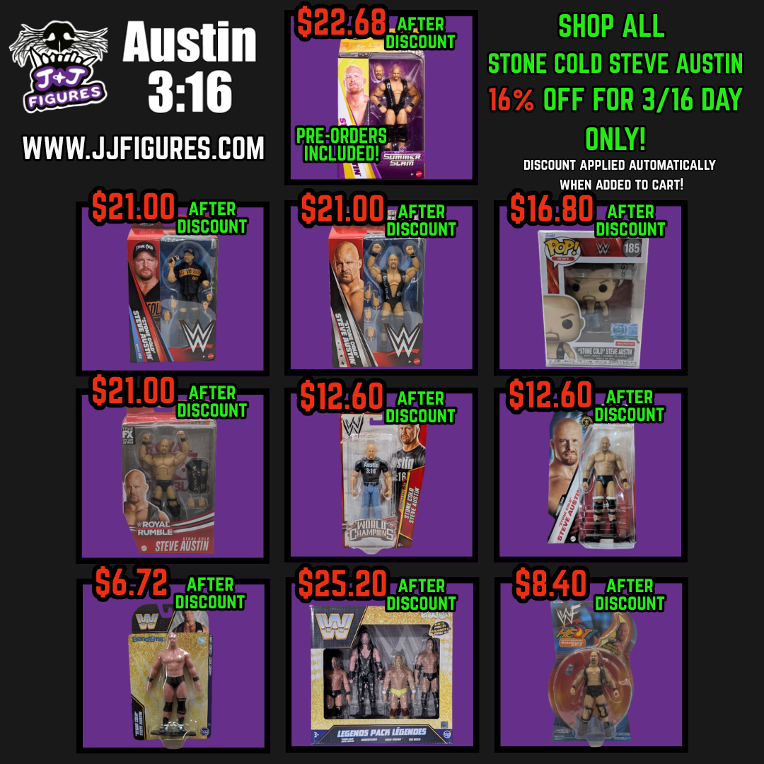Happy 3:16 Day to all who celebrate! Be sure to grab yourself a deal on ANY 'Stone Cold' Steve Austin figure we have in stock (AND PREORDER)! Just add to cart and watch the savings pile up like a Stunner party in the ring!
